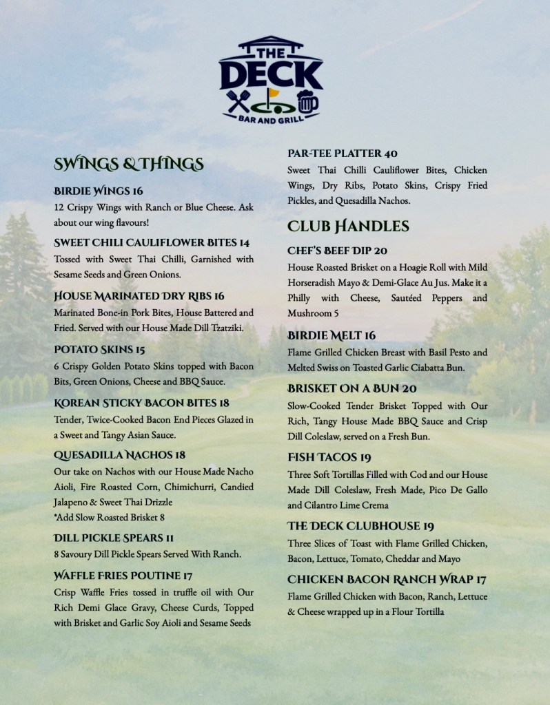 Hours may vary dependent on golf season and operation. Visit our Facebook page ‘The Deck Bar & Grill’ for updates about opening/closing, specials, weekly features and more!